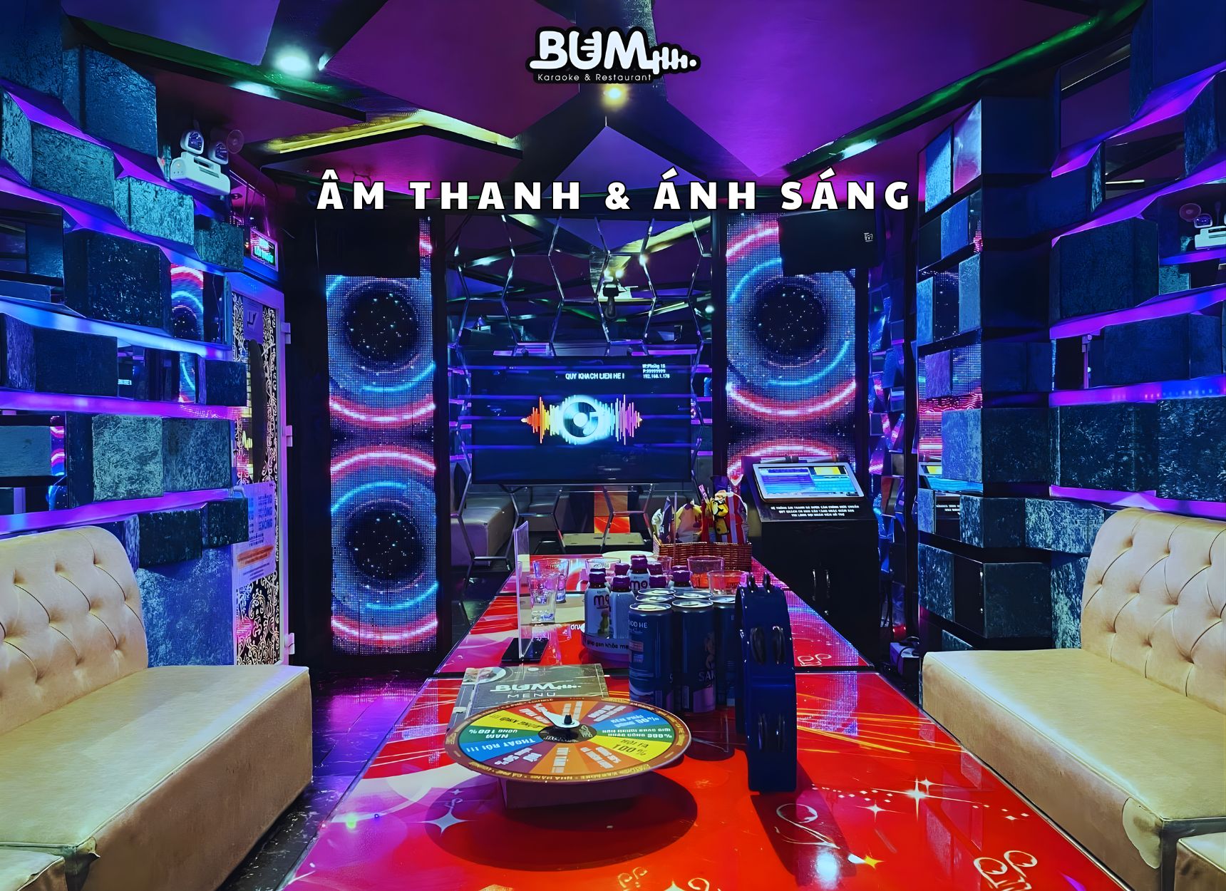 Hệ thống ánh sáng – decor mạnh mẽ, mang đậm phong cách trẻ trung, hiện đại, phù hợp cho những buổi tiệc sôi động. Dù bạn đi cùng gia đình hay hội bạn thân, không gian tại quán karaoke chất lượng Bum vẫn tạo được sự riêng tư nhưng không kém phần náo nhiệt.