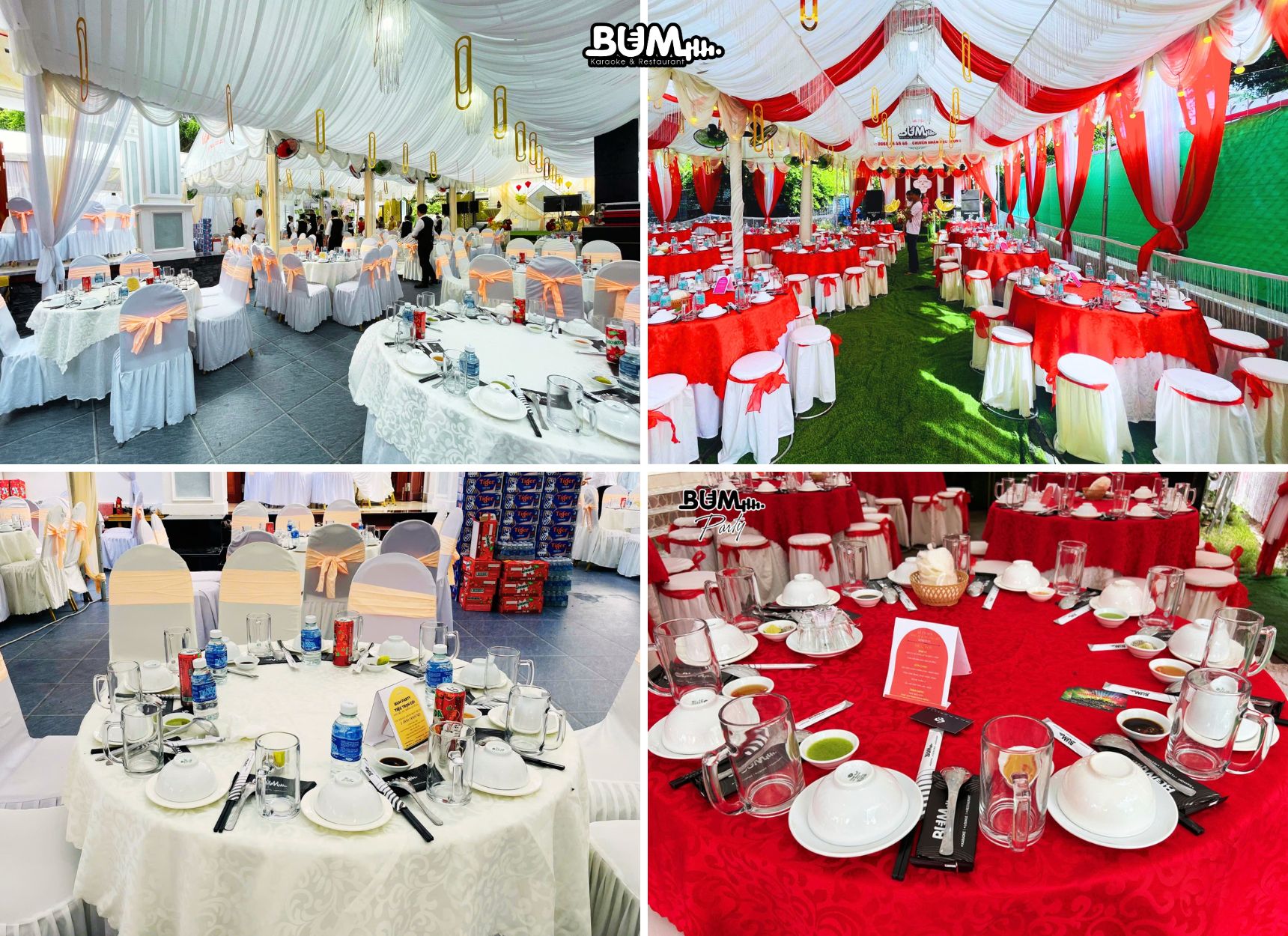 Nhà hàng Bum đảm nhận toàn bộ khâu set up bàn ghế, khăn trải bàn, dụng cụ ăn uống cho tiệc cưới. Không gian được bố trí hợp lý, khoa học, giúp khách mời cảm thấy thoải mái khi tham dự tiệc. Việc sử dụng dịch vụ trọn gói giúp gia đình không phải lo lắng thuê mướn riêng lẻ, từ đó tiết kiệm đáng kể ngân sách.