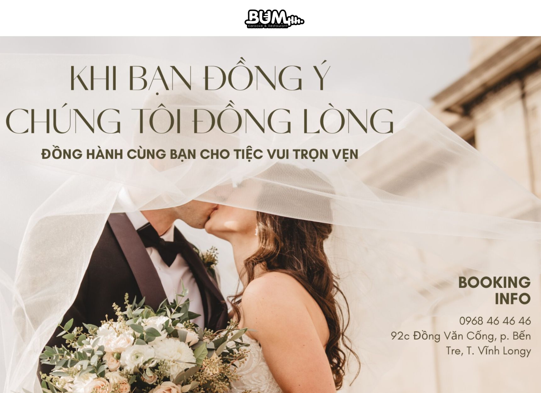Ngày cưới là sự kiện trọng đại chỉ có một lần trong đời, và ai cũng mong muốn ngày ấy diễn ra thật trọn vẹn. Với dịch vụ tổ chức tiệc cưới trọn gói, chi phí hợp lý cùng sự tận tâm trong từng chi tiết, nhà hàng nổi tiếng Bum sẽ là người bạn đồng hành đáng tin cậy, giúp bạn hiện thực hóa một lễ cưới cuối năm ấm áp, ý nghĩa mà không phải lo lắng về ngân sách. Hãy để Bum cùng bạn viết nên câu chuyện hạnh phúc bắt đầu từ ngày hôm nay.