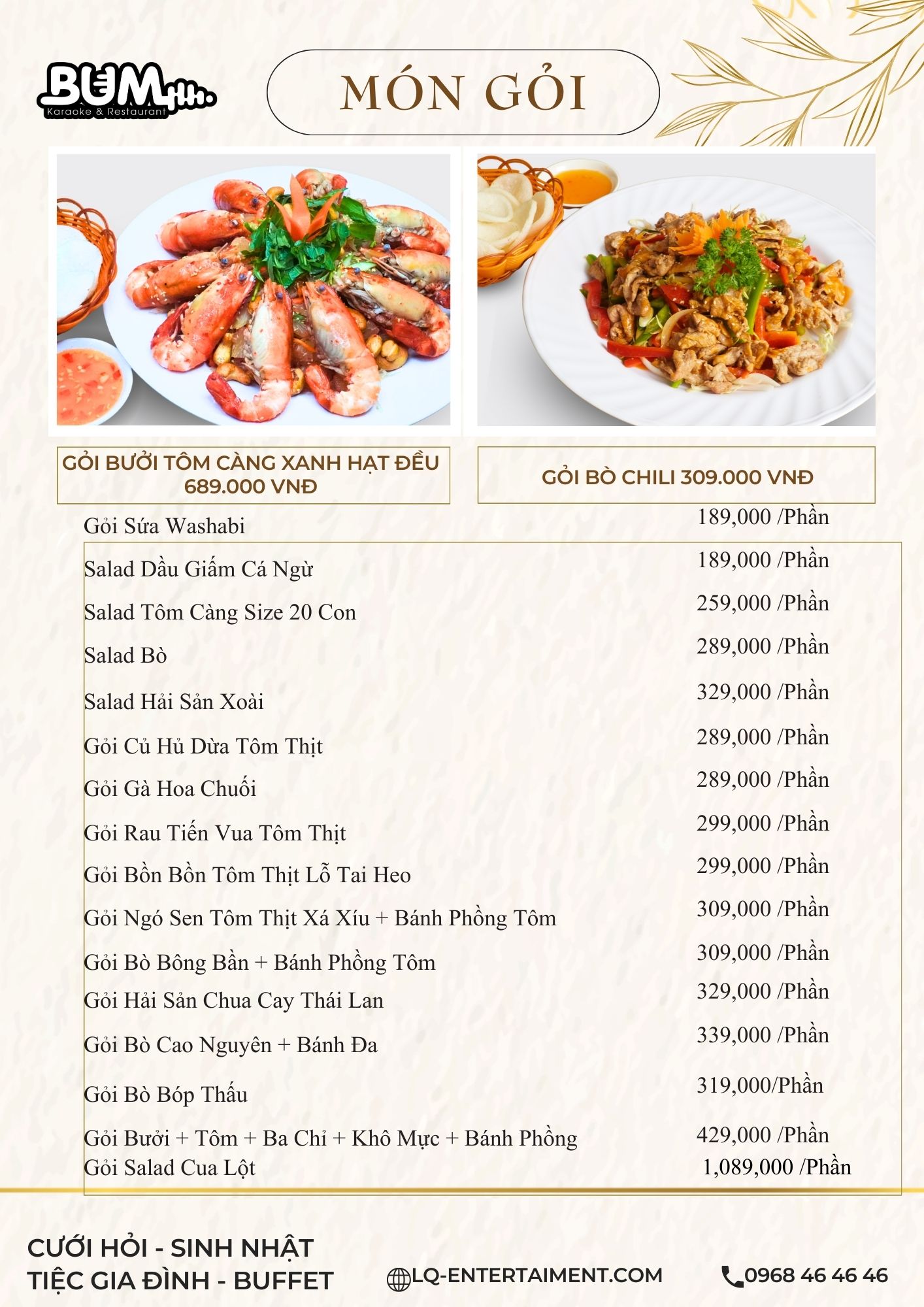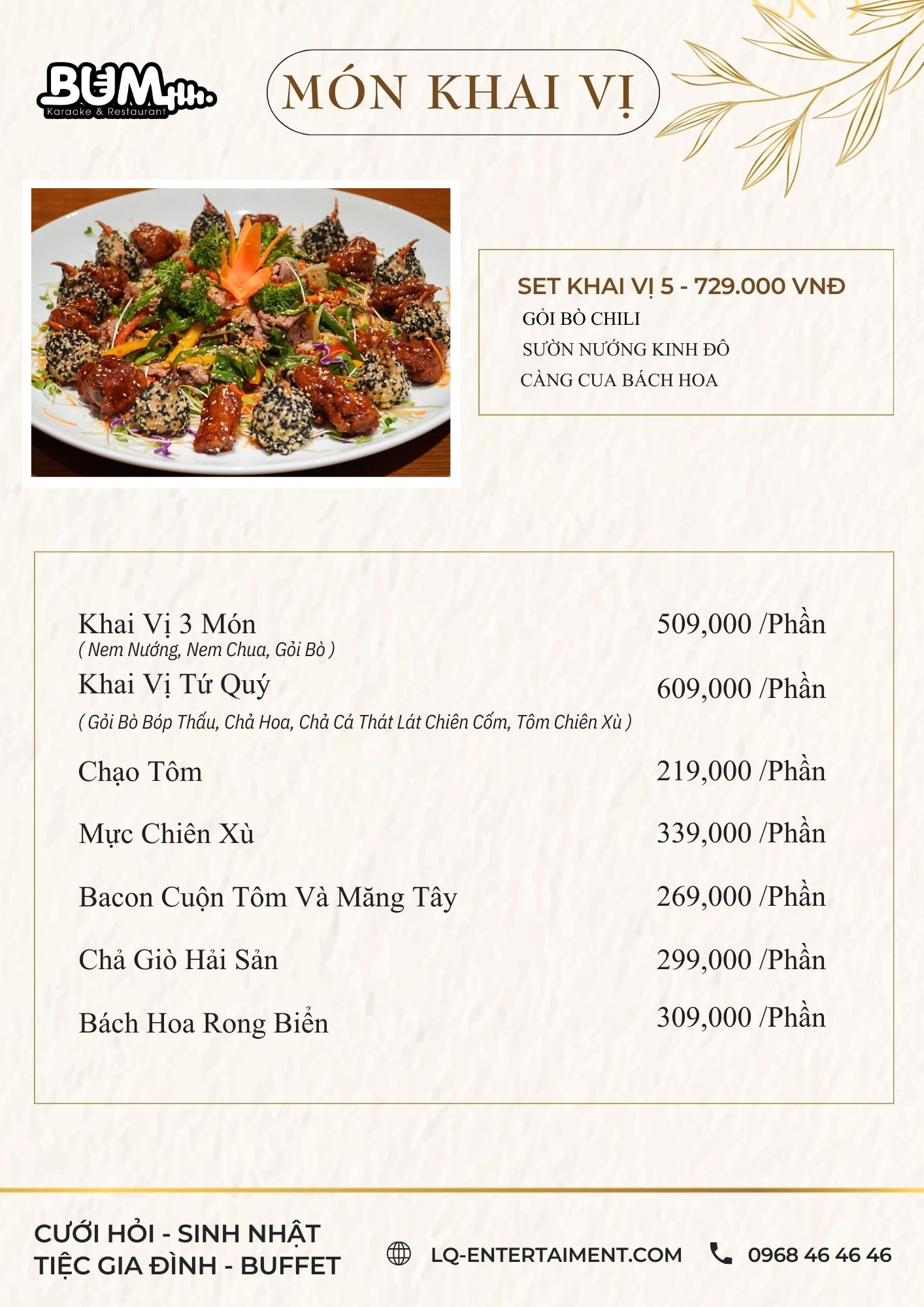 Dưới đây là một số gợi ý món khai vị cho thực đơn đặt tiệc giá rẻ tại nhà hàng Bum ở Bến Tre, liên hệ ngay 0968.46.46.46 để được hỗ trợ tư vấn và đặt tiệc: