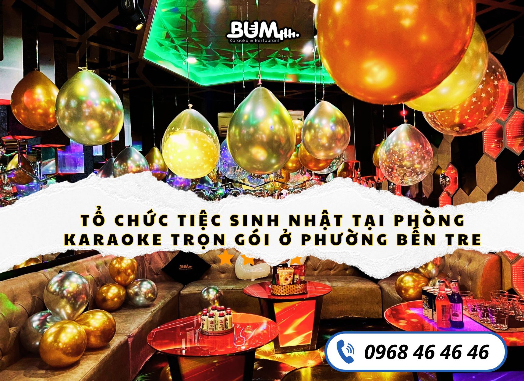 Việc tổ chức sinh nhật không còn là nỗi lo khi đã có dịch vụ trọn gói tiện lợi. Hãy để karaoke Bum tại phường Bến Tre đồng hành cùng bạn trong những khoảnh khắc quan trọng, giúp ngày đặc biệt trở nên trọn vẹn và ý nghĩa hơn. Liên hệ hotline 0968 46 46 46 để được tư vấn đặt tiệc hoặc đặt phòng karaoke và dịch vụ tổ chức tiệc tại phòng karaoke trọn gói giá rẻ tại karaoke Bum!