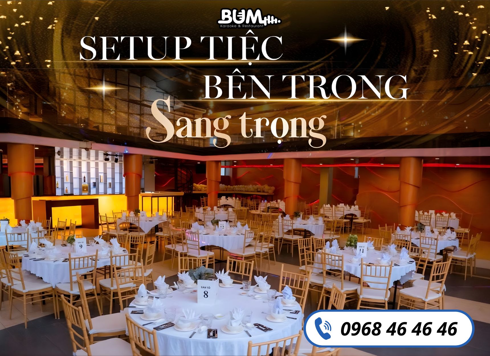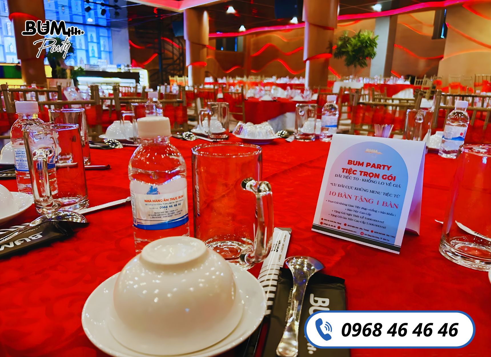 Nhà hàng Bum sở hữu không gian tiệc hiện đại, rộng rãi và được đầu tư bài bản. Hệ thống sảnh tiệc được trang trí tinh tế theo chủ đề “Year End Party” hoặc “Gala Dinner”, tạo không khí lễ hội rộn ràng và sang trọng. Với sức chứa linh hoạt, Bum có thể đáp ứng cả tiệc nhỏ 50 khách đến đại tiệc hàng trăm người, phù hợp cho mọi loại hình tổ chức.