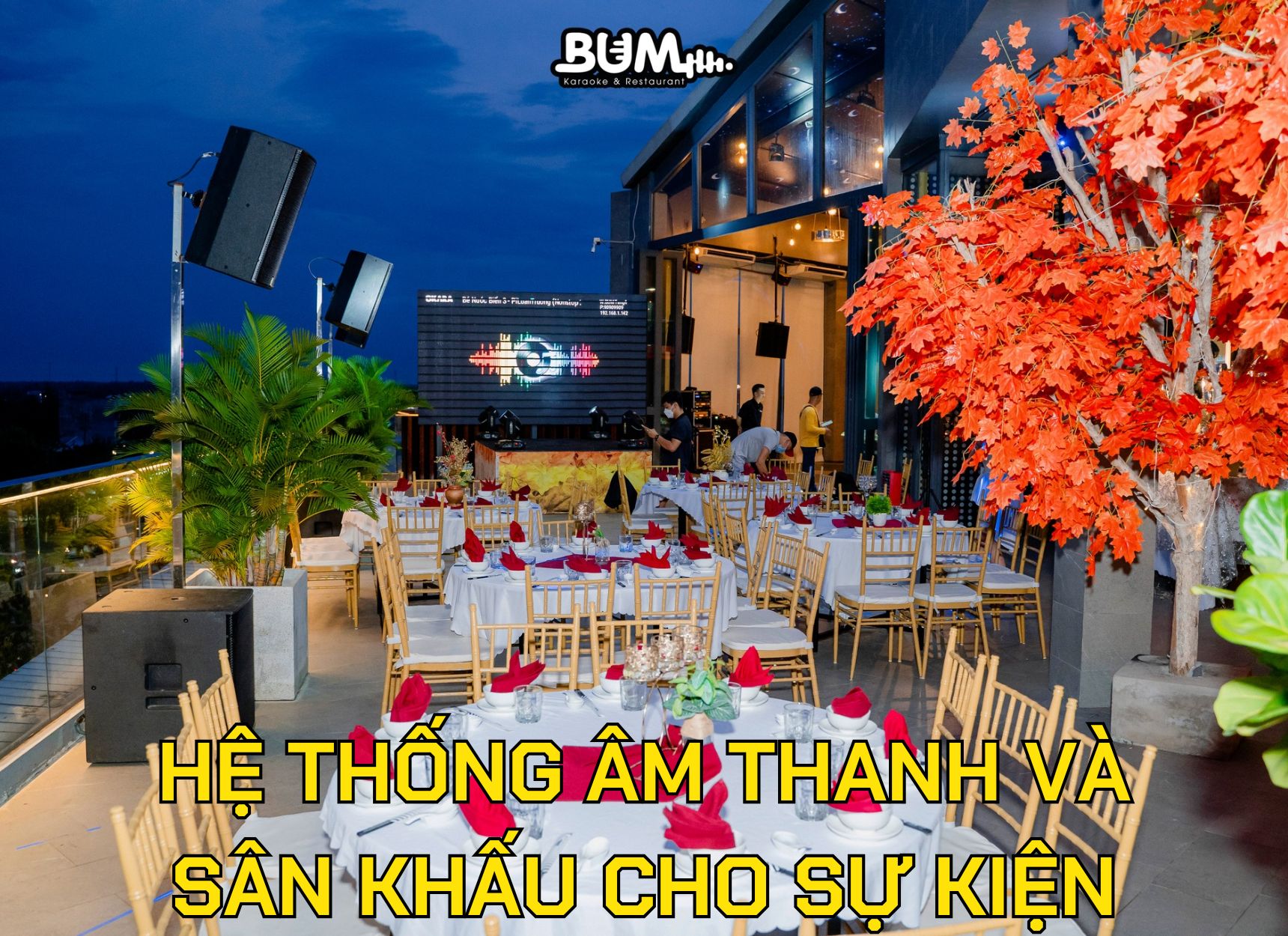 Nhà hàng Bum cung cấp dịch vụ tổ chức sự kiện trọn gói từ khâu chuẩn bị đến khi kết thúc buổi lễ. Bạn chỉ cần đưa ra yêu cầu về số lượng khách mời cũng như phong cách trang trí mong muốn; đội ngũ nhân viên sẽ lo liệu mọi thứ còn lại.