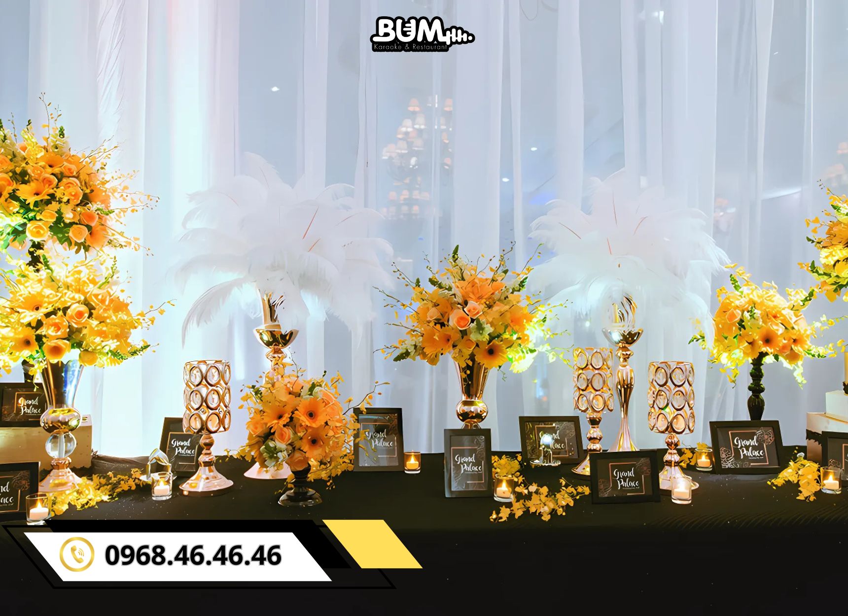 Liên hệ qua số hotline 0968.46.46.46 để được tư vấn chi tiết về các gói đặt tiệc tại nhà hàng tổ chức tiệc cưới Bum!