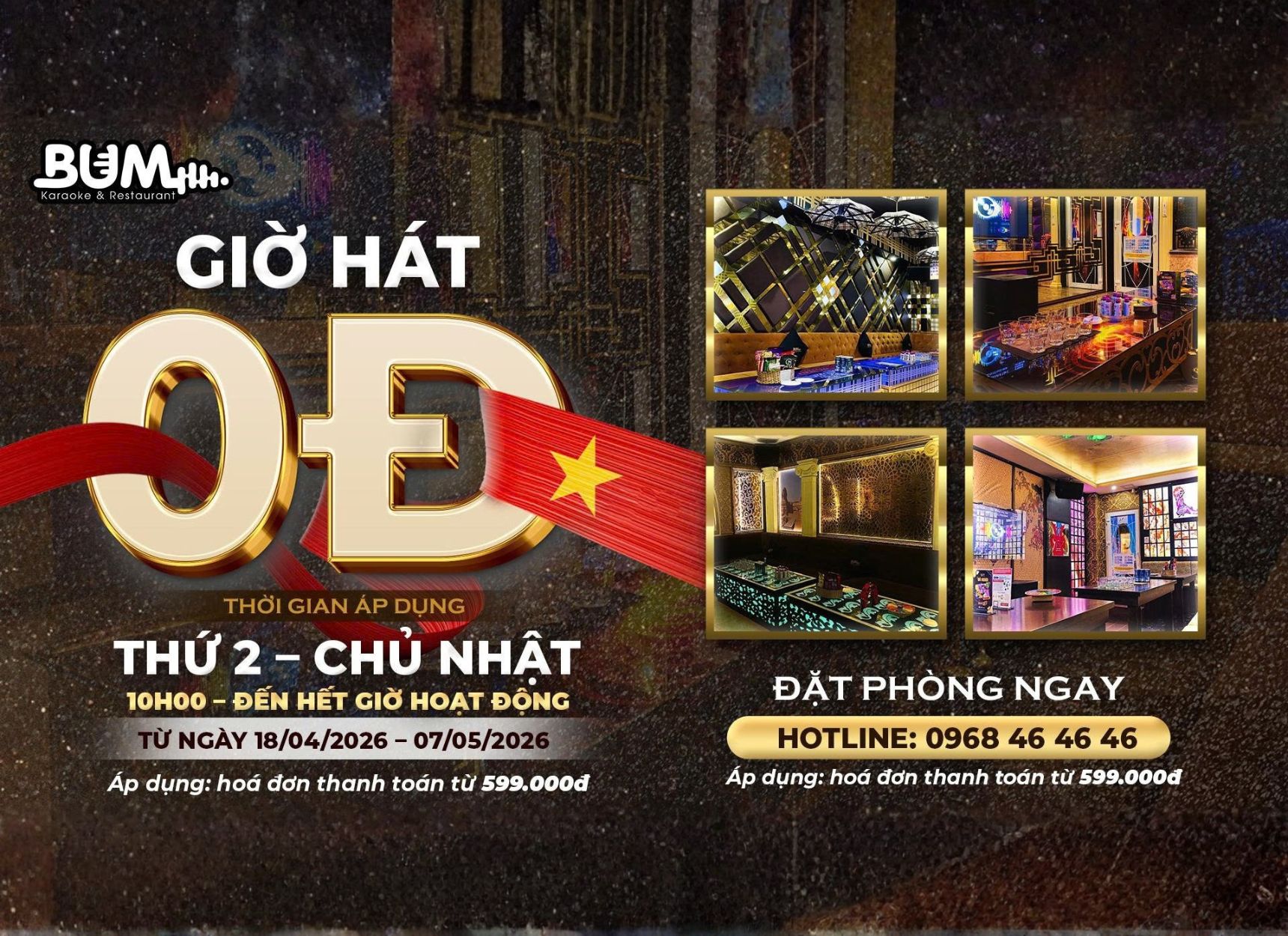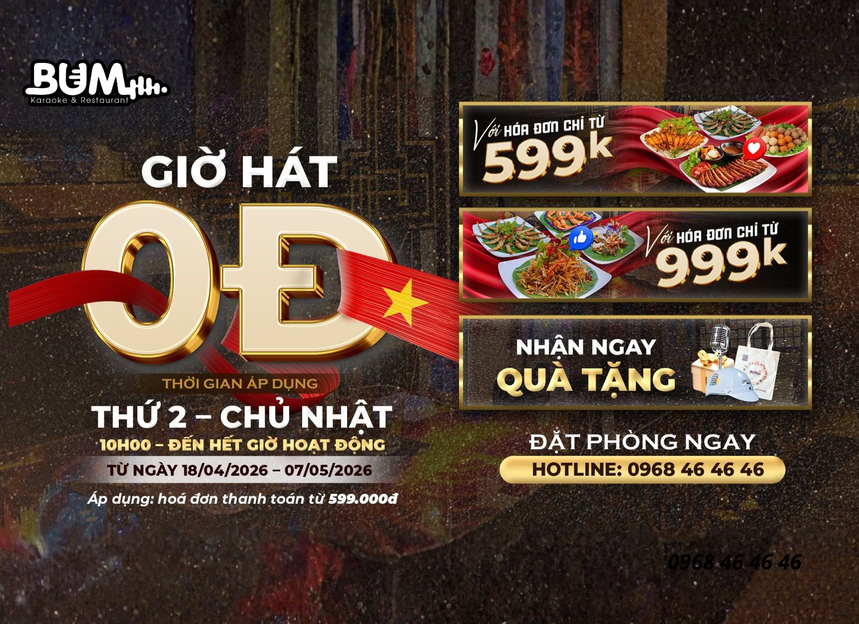 “Chương trình khuyến mãi giờ hát 0 đồng” tại Bum Karaoke là cơ hội tuyệt vời để bạn và người thân tận hưởng âm nhạc, giải trí và ẩm thực trong dịp lễ 30/04 – 01/05. Với ưu đãi miễn phí giờ hát, quà tặng hấp dẫn và không gian sang trọng, Bum Karaoke xứng đáng là lựa chọn hàng đầu cho những buổi gặp gỡ, tiệc tùng.