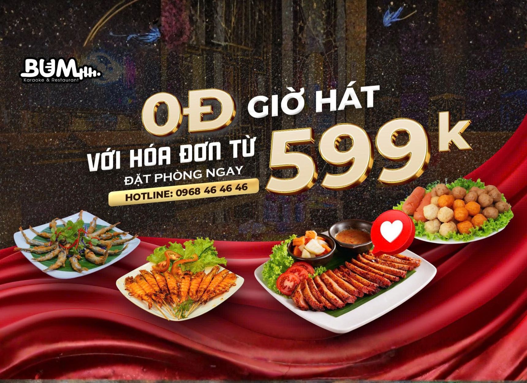 Nhân dịp kỷ niệm Ngày Giải phóng miền Nam 30/04, Bum Karaoke triển khai “Chương trình khuyến mãi giờ hát 0 đồng” cực hấp dẫn dành cho tất cả khách hàng. Khách hàng khi đến Bum trong thời gian ưu đãi sẽ được miễn phí giờ hát khi sử dụng hoá đơn từ 599k. Đây là cơ hội để bạn và người thân có thể ca hát thả ga mà không lo về chi phí giờ hát.