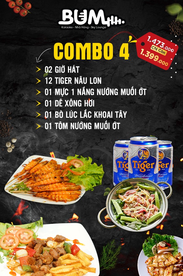 Có dịp ghé Bum vui chơi ca hát, nhất định khách iu phải thử combo 4 siêu bén mồi này nha. Đã ngon lại còn ưu đãi xịn, chỉ với 1tr399k (giá gốc 1tr473k) là bạn đã có ngay một combo toàn những món ngon cho mọi người ăn uống no nê, ca hát tưng bừng rồi.