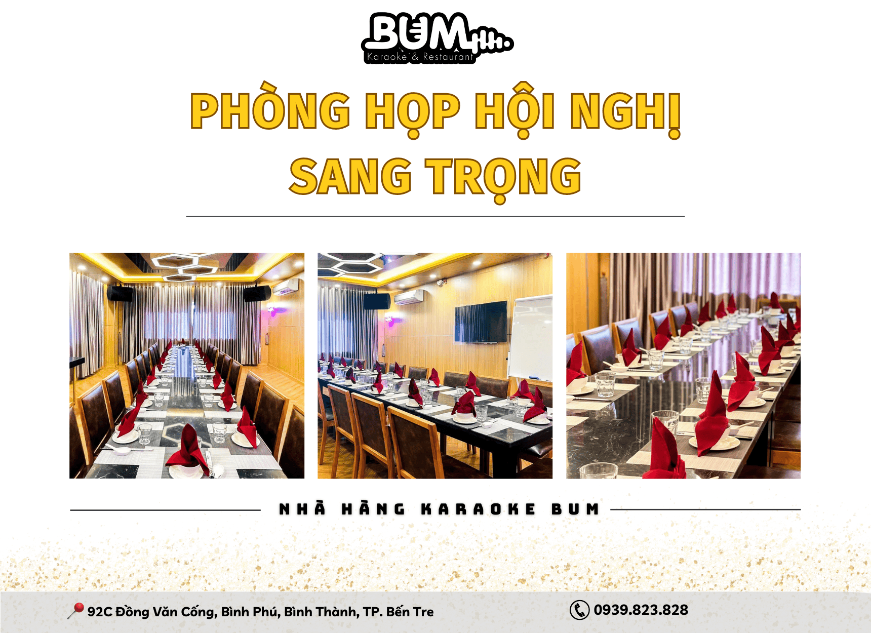 Nổi bật trong danh sách các địa điểm cho thuê phòng hội nghị tại Bến Tre chính là Nhà hàng Karaoke Bum. Đây không chỉ là một địa điểm giải trí mà còn là nơi cung cấp dịch vụ cho thuê phòng họp hội nghị nhỏ và sang trọng nhất.