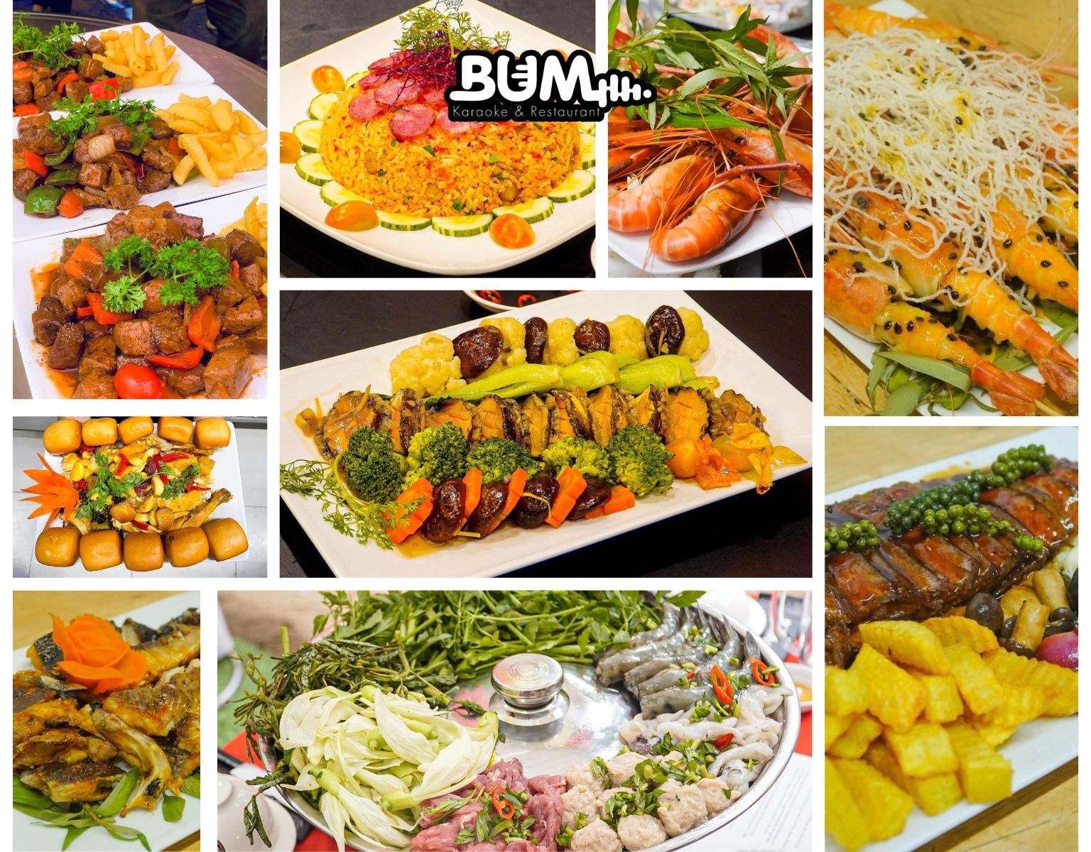 - Thực đơn tiệc đa dạng: Menu hơn 150+ món ăn, nước uống được các đầu bếp tại Nhà hàng Karaoke BUM chế biến theo phong cách riêng. Menu đầy đủ các món ăn từ khai vị, món chính đến tráng miệng với đầy đủ các chất dinh dưỡng. Khách hàng có thể lựa chọn những món ăn theo yêu cầu hoặc có những set tiệc gợi ý với đa dạng phân khúc.