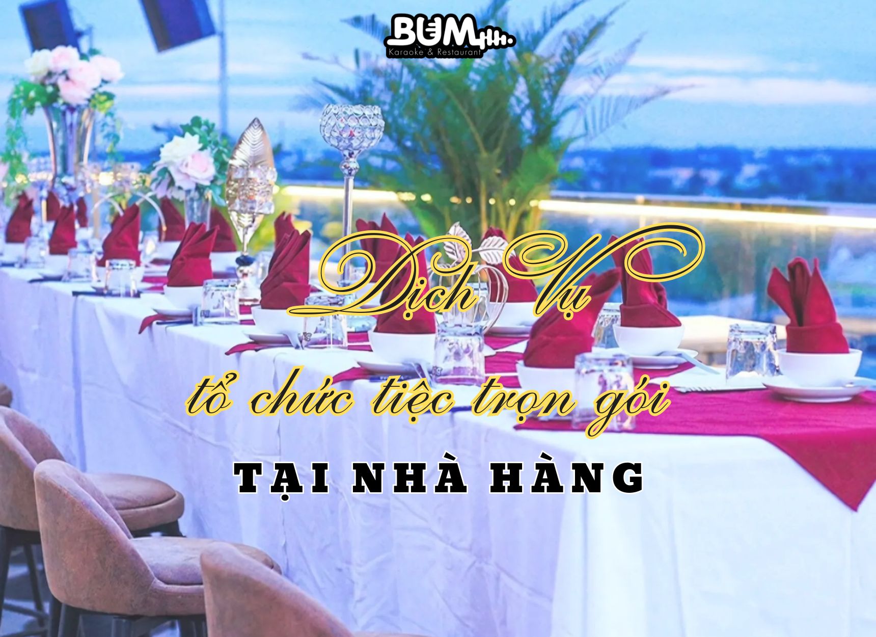 Nhà hàng Bum nhận tổ chức tiệc trọn gói tại nhà hàng với nhiều loại hình tiệc như: Tiệc Sinh Nhật, Tiệc Cưới, Tiếp Khách Doanh Nghiệp, Liên Hoan Cuối Năm, Tiệt Tất Niên,.... Đáp ứng nhu cầu tiết kiệm chi phí và hỗ trợ toàn diện với dịch vụ tổ chức tiệc trọn gói giá rẻ tại nhà hàng.