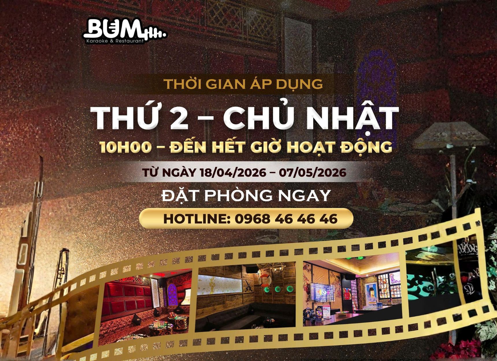 Nhân ngày Giải phóng miền Nam 30/04 và để tri ân các khách hàng đã luôn ủng hộ và tin tưởng Bum Karaoke trong suốt thời gian vừa qua, nhà hàng triển khai ưu đãi cực hot với chương trình khuyến mãi giờ hát 0 đồng, giúp khách hàng vừa tiết kiệm chi phí, vừa tận hưởng trọn vẹn những buổi gặp gỡ cùng bạn bè, người thân và đồng nghiệp.