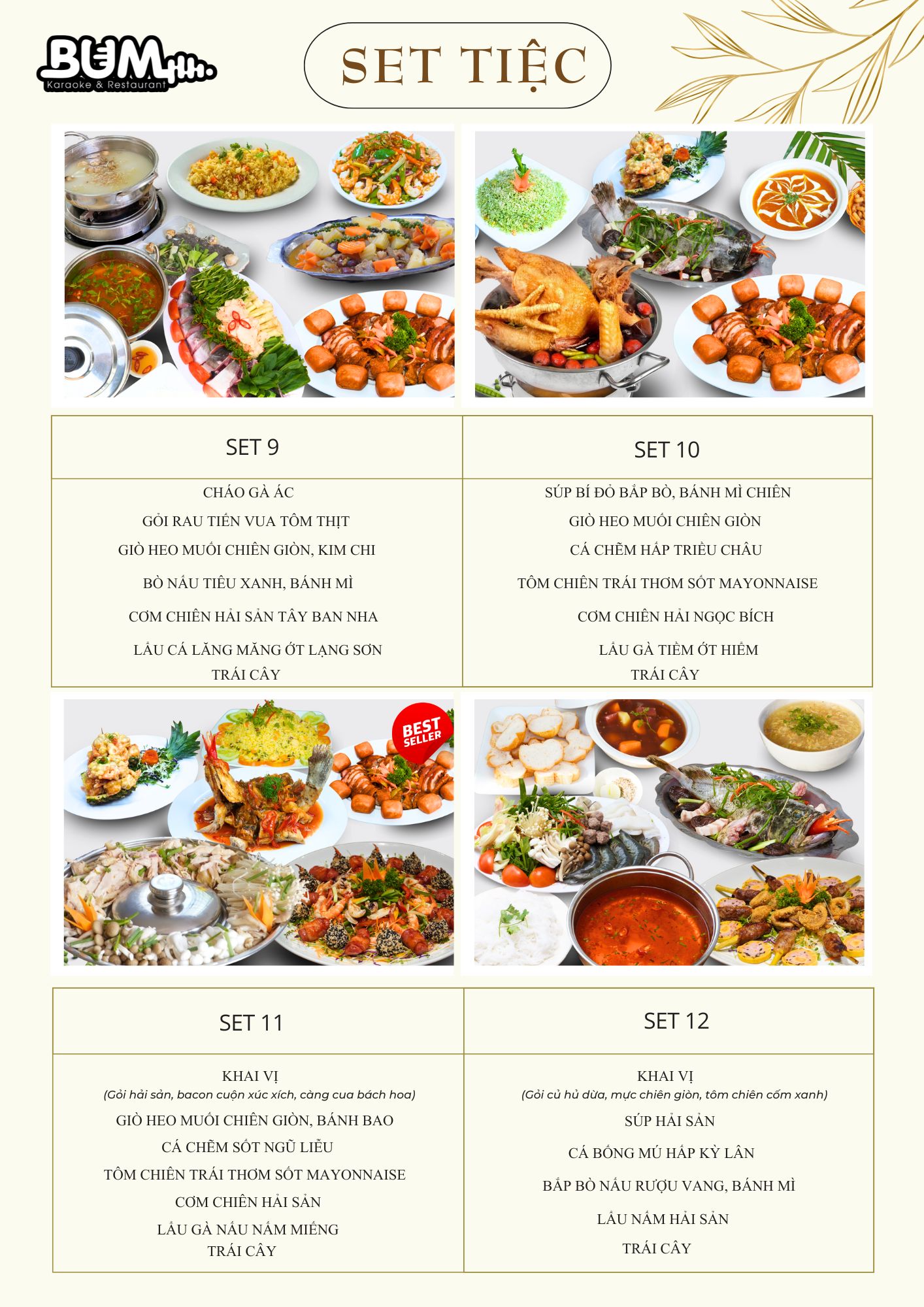 Bốn set tiệc 9 – 10 – 11 – 12 của nhà hàng Bum Karaoke & Restaurant không chỉ mang đến sự đa dạng về hương vị mà còn thể hiện sự tinh tế trong cách chế biến và trình bày. Từ món khai vị, món chính đến lẩu và tráng miệng, mỗi set đều được chọn lọc kỹ lưỡng, đảm bảo phù hợp cho mọi dịp tiệc tùng, họp mặt, sinh nhật hay liên hoan công ty.