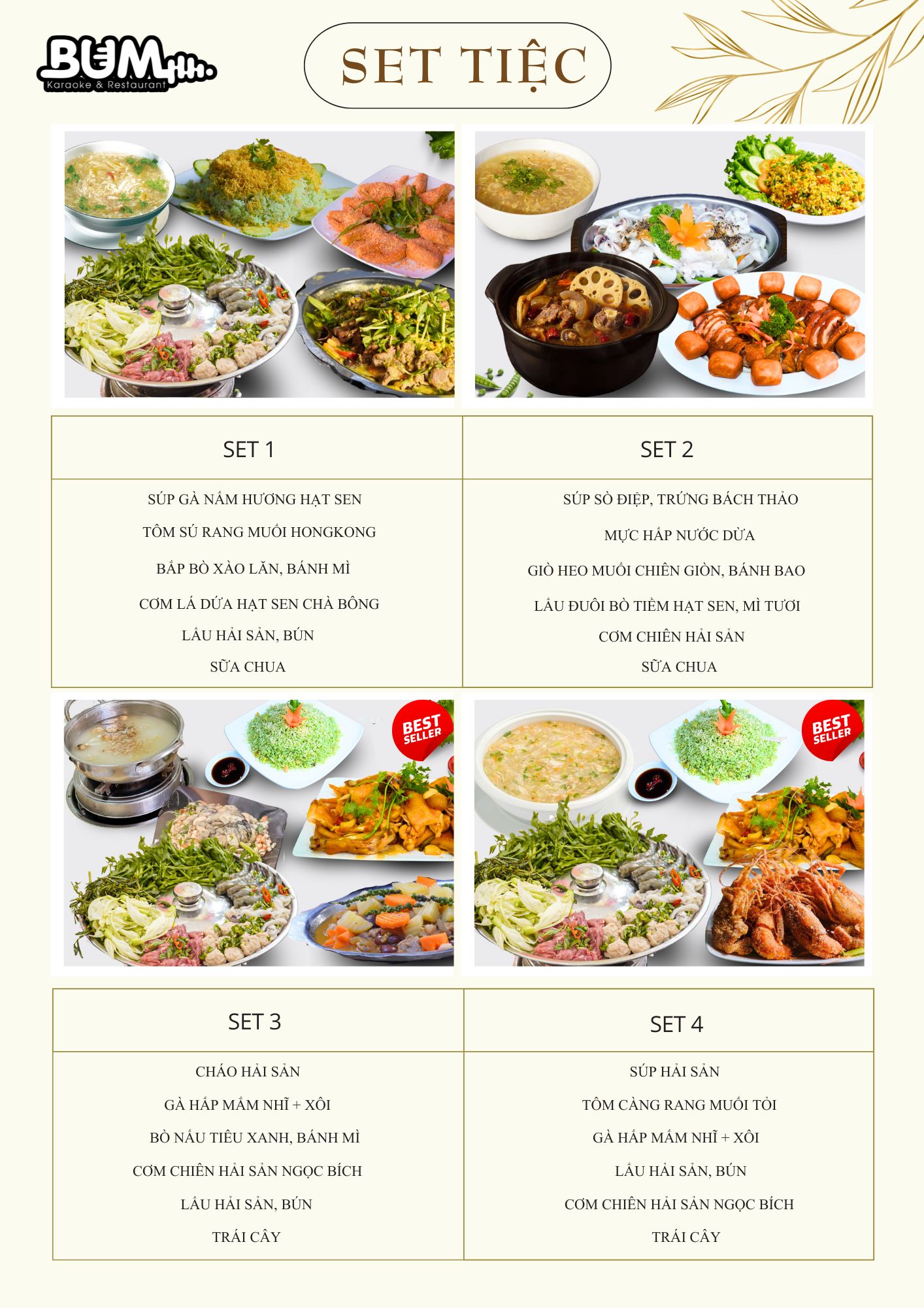 Bốn set menu tiệc tại Bum Karaoke & Restaurant không chỉ là những bữa ăn ngon mà còn là sự kết hợp tinh tế giữa hương – sắc – vị, mang đến trải nghiệm ẩm thực trọn vẹn cho mọi thực khách.