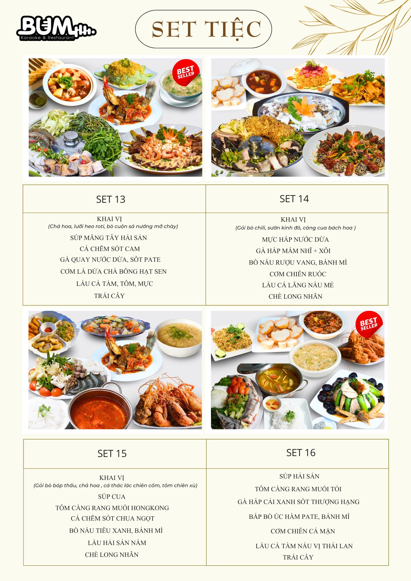 Khi nhu cầu tổ chức tiệc ngày càng được chú trọng, việc lựa chọn một set menu vừa ngon miệng, vừa đẹp mắt lại phù hợp với nhiều đối tượng khách mời trở thành ưu tiên hàng đầu. Tại nhà hàng Bum – địa điểm quen thuộc cho những buổi họp mặt, sinh nhật hay tiệc gia đình – các set menu tiệc 13, 14, 15, 16 được thiết kế công phu, kết hợp hài hòa giữa ẩm thực truyền thống và phong cách chế biến hiện đại. Mỗi set không chỉ mang đến trải nghiệm vị giác trọn vẹn mà còn tạo nên bữa tiệc chỉn chu, sang trọng và đáng nhớ.