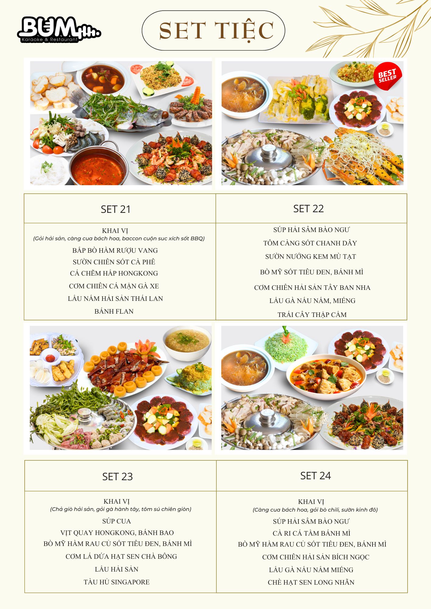 Bốn set tiệc 9, 10, 11 và 12 tại nhà hàng Bum Karaoke & Restaurant đều được đầu bếp chế biến công phu, đảm bảo sự cân bằng giữa hương vị, hình thức và dinh dưỡng. Mỗi set mang một phong cách riêng – từ truyền thống, tinh tế cho đến hiện đại, phù hợp với mọi nhu cầu tổ chức tiệc: gia đình, bạn bè hay doanh nghiệp.