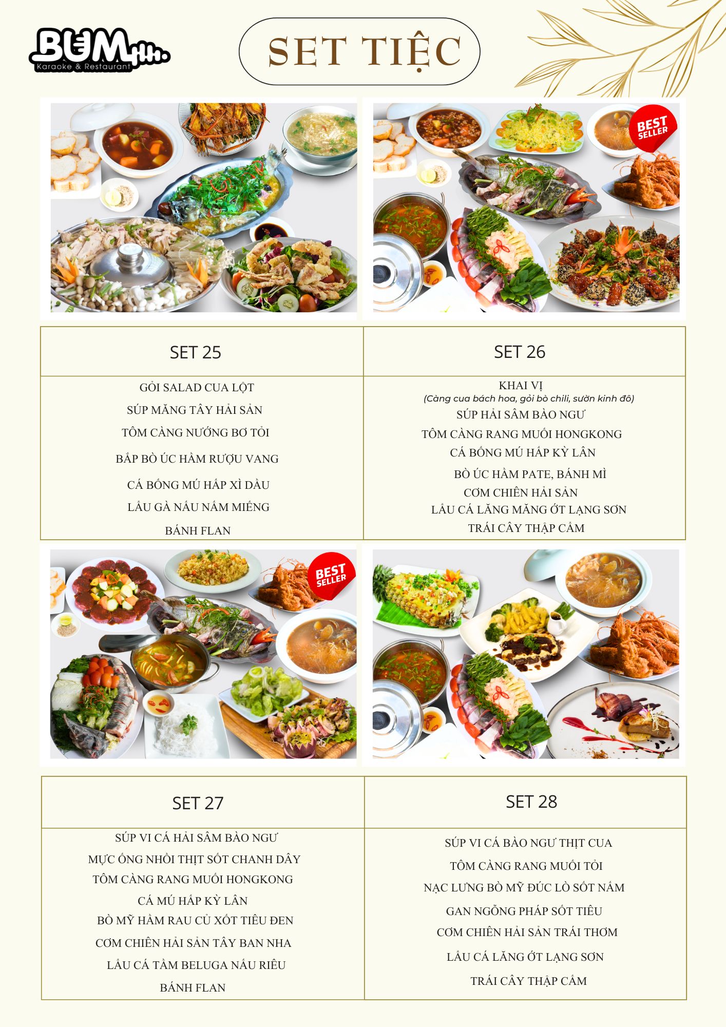Set menu 25, 26, 27, 28 là minh chứng cho sự đầu tư nghiêm túc của nhà hàng Bum trong việc nâng tầm trải nghiệm ẩm thực. Mỗi set mang một màu sắc riêng – từ thanh nhẹ, tinh tế đến sang trọng, đẳng cấp – giúp bạn dễ dàng lựa chọn theo quy mô và phong cách buổi tiệc.