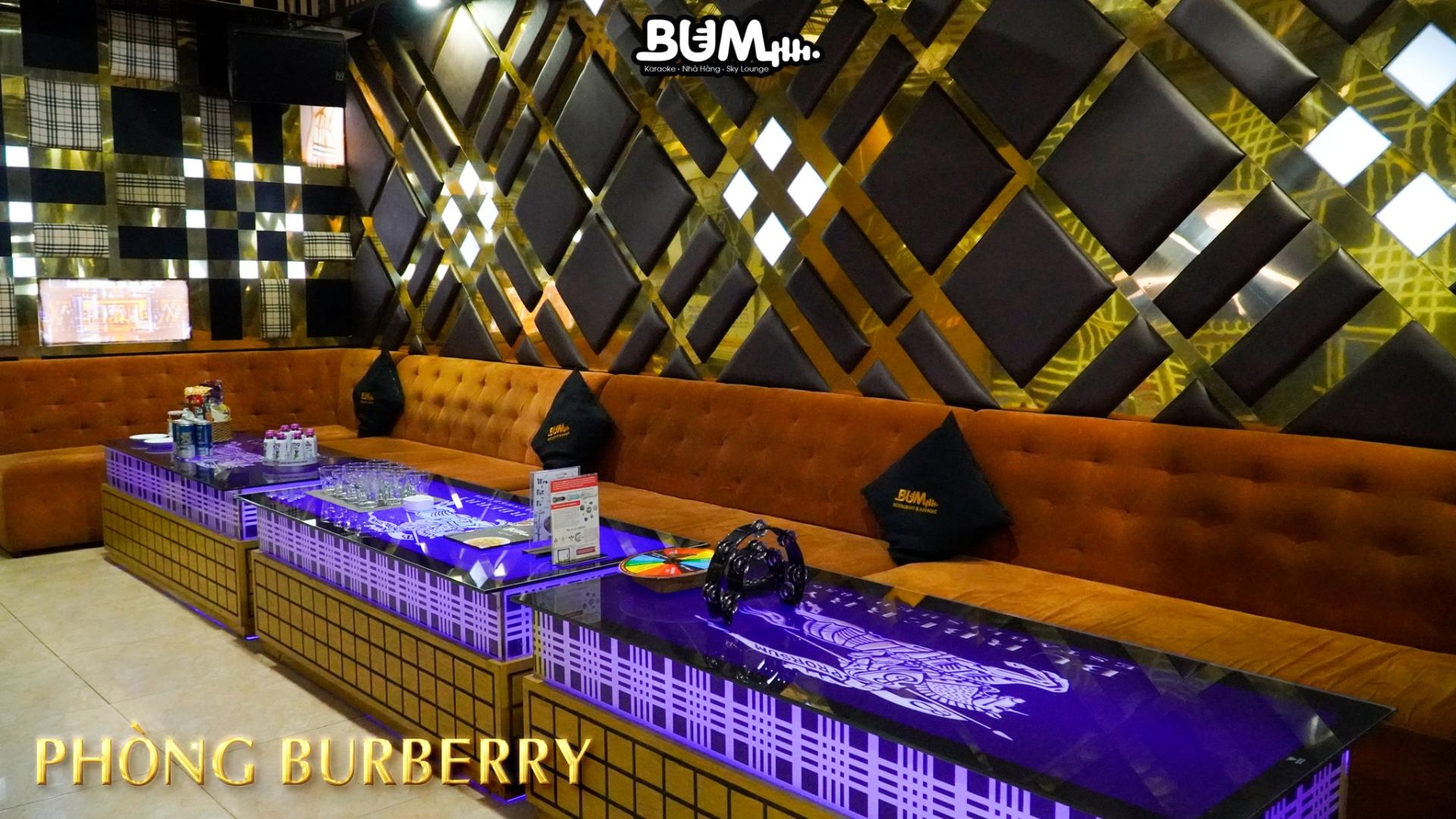 Được lấy cảm hứng từ thương hiệu thời trang cao cấp Burberry với những họa tiết kẻ karo được trang trí khắp nơi, phòng karaoke Burberry chính là phòng karaoke dành cho 15 người mà bạn không thể bỏ lỡ khi có dịp ghé BUM. Với việc sử dụng các tone màu tối kết hợp với vàng đầy sang trọng làm chủ đạo, phòng Burberry sẽ mang đến cho quý khách hàng nên một không gian đầy đẳng cấp, thời thượng và cá tính.