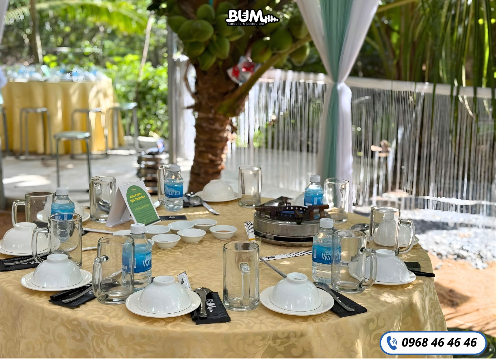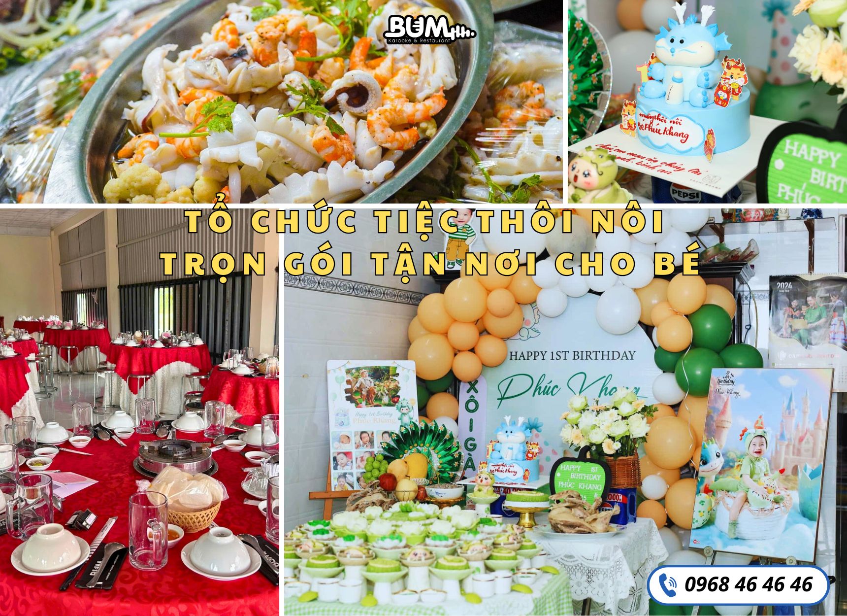 Dịch vụ tổ chức tiệc thôi nôi trọn gói tận nơi của nhà hàng Bum ra đời như một “cứu tinh” cho các gia đình hiện đại. Chỉ cần chia sẻ mong muốn, nhà hàng tổ chức tiệc trọn gói tận nơi Bum sẽ mang đến cho bạn một bữa tiệc hoàn chỉnh – từ không gian trang trí, món ăn, bàn tiệc đến đội ngũ phục vụ chuyên nghiệp. Tất cả được chuẩn bị kỹ lưỡng để bố mẹ có thể tận hưởng trọn vẹn niềm vui bên con yêu mà không lo bất kỳ công đoạn nào.
